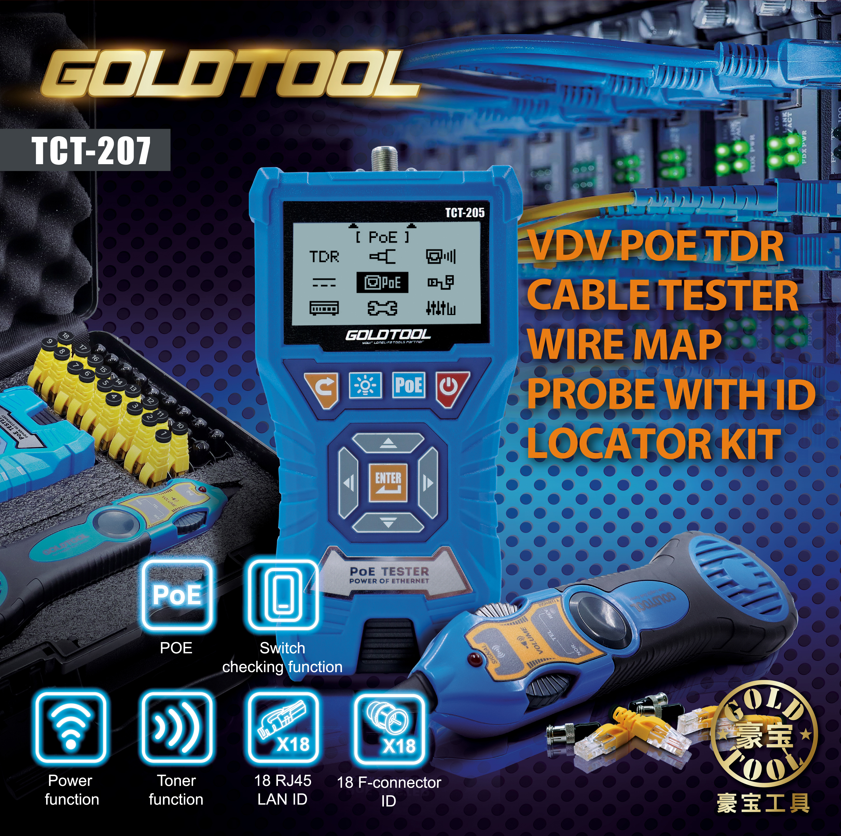Built for registered data and communications cablers working on Australian structured cabling installations, this professional PoE Ethernet Tester Kit replaces the need for multiple tools on site. It combines PoE detection, TDR cable length measurement, Ethernet wire mapping, and tone and probe tracing in one rugged carry case, handling everything from initial verification to faultfinding on active and passive networks without disturbing cabling or network configuration. The included 36-piece ID terminator set, with 18 RJ45 LAN connectors and 18 F-Connector terminators, makes it equally capable on structured cabling and multirun identification work across commercial and residential environments.